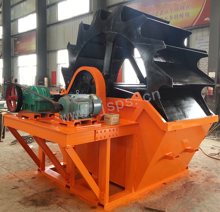 該洗砂機由傳動系統、輪斗、機架等主要部件組成,電動機通過三角皮帶經減速機,小齒輪與大齒輪嚙合,從而帶動輪斗轉動,輪斗把洗砂槽內洗凈的砂子提出,通過皮帶輸送至集料場。